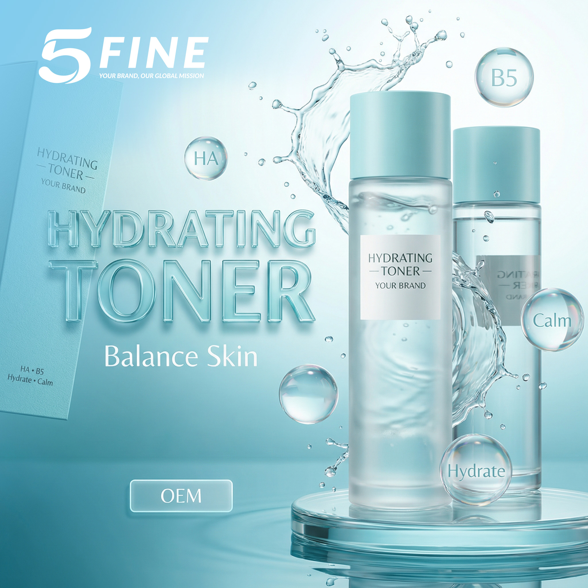 At 5FINE, we formulate toners with key ingredients such as Hyaluronic Acid (HA) and Vitamin B5, known for their powerful hydration and calming properties. The lightweight, water-based texture absorbs quickly into the skin, leaving it soft, balanced, and ready for the next skincare steps.