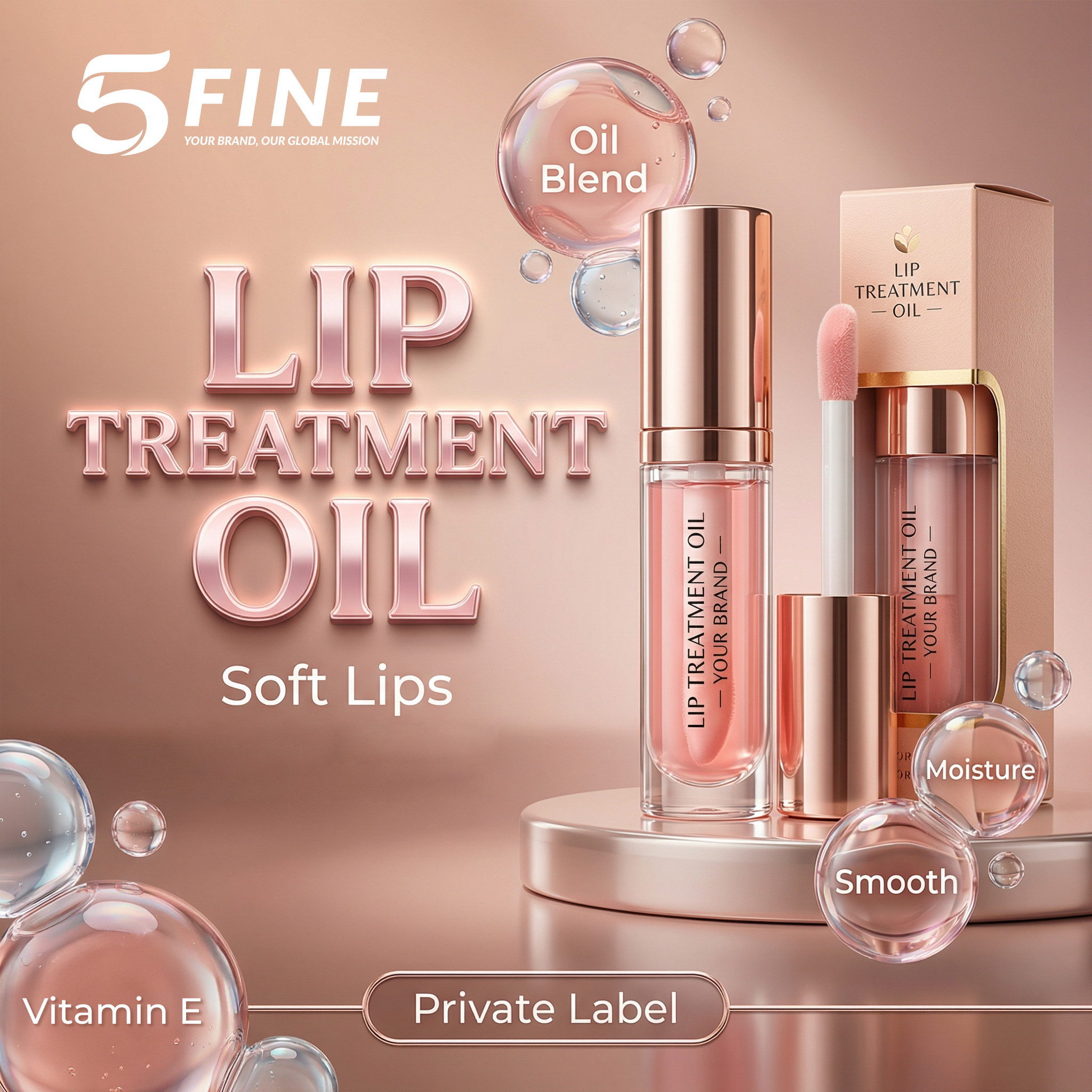 At 5FINE, we develop lip oils using a combination of Vitamin E and premium oil blends, delivering deep moisture while maintaining a lightweight, non-sticky texture. The formula helps improve lip softness, reduce dryness, and enhance natural shine — making it ideal for both daily care and beauty-focused product lines.
